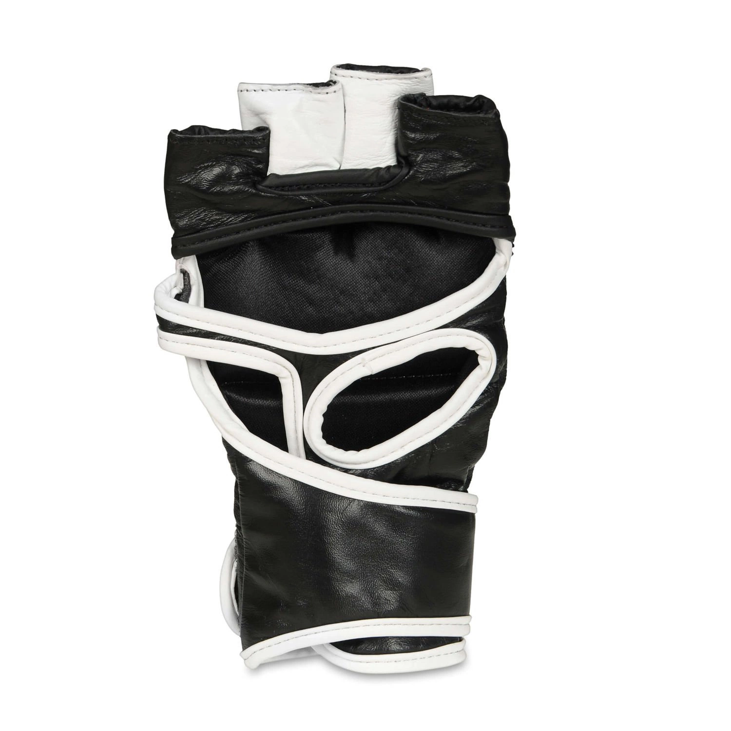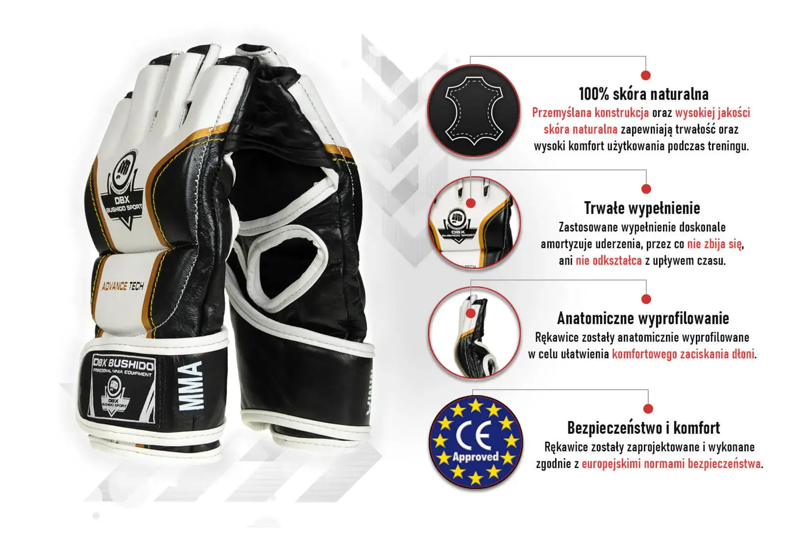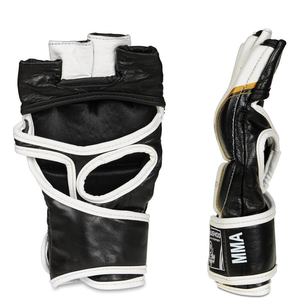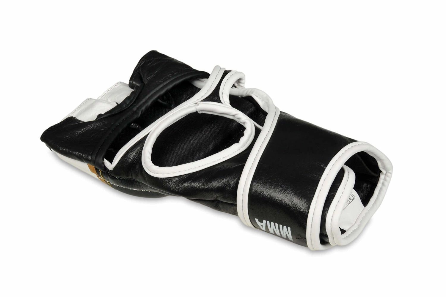 - Leather MMA gloves made of natural cowhide. Color: black, white and gold