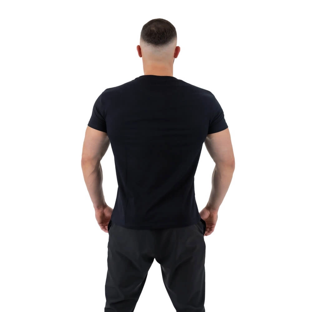 Designed with attention to detail, this T-shirt features a tailored cut that enhances the male physique. A reinforced neck tape with Lycra ensures the neckline retains its shape without stretching, maintaining a sleek appearance. For added comfort, the design eliminates side seams, providing a seamless feel against the skin.