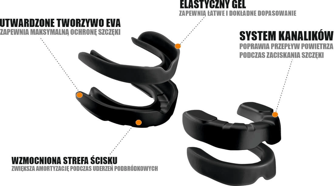 Protectors from the GelTech line are made of 2 protective layers - an outer harder one, which is responsible for protecting the teeth from impact, and an inner softer one, which ensures a precise fit to the shape of the dentition. The mouthguard has additional breathing channels - facilitating the flow of air when clenching the jaw. Included with the protector you will receive an antibacterial box for its storage.