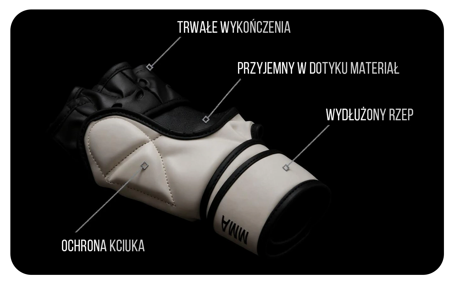- Rękawice MMA wykonane ze wzmocnionej skóry syntetyczne.