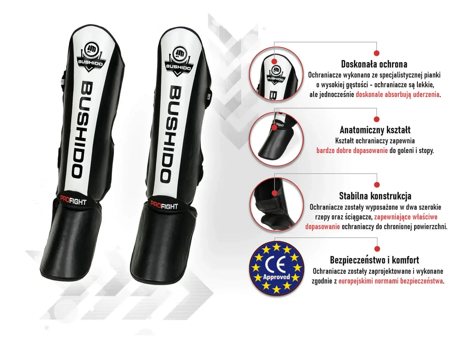 - Ochraniacze na piszczele i stopy przeznaczone do sportów walki.