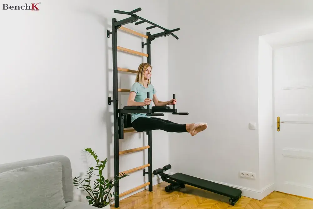 • Zestaw zawiera: drabinkę, drążek do podciągania z 6-cioma uchwytami mocowany na stałe, poręcze do ćwiczeń z podparciem pod plecy i rozbudowaną ławką
